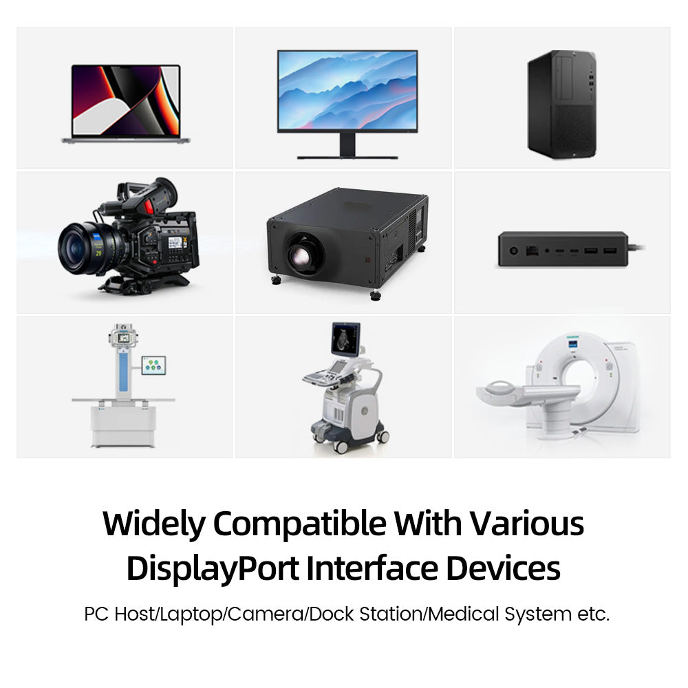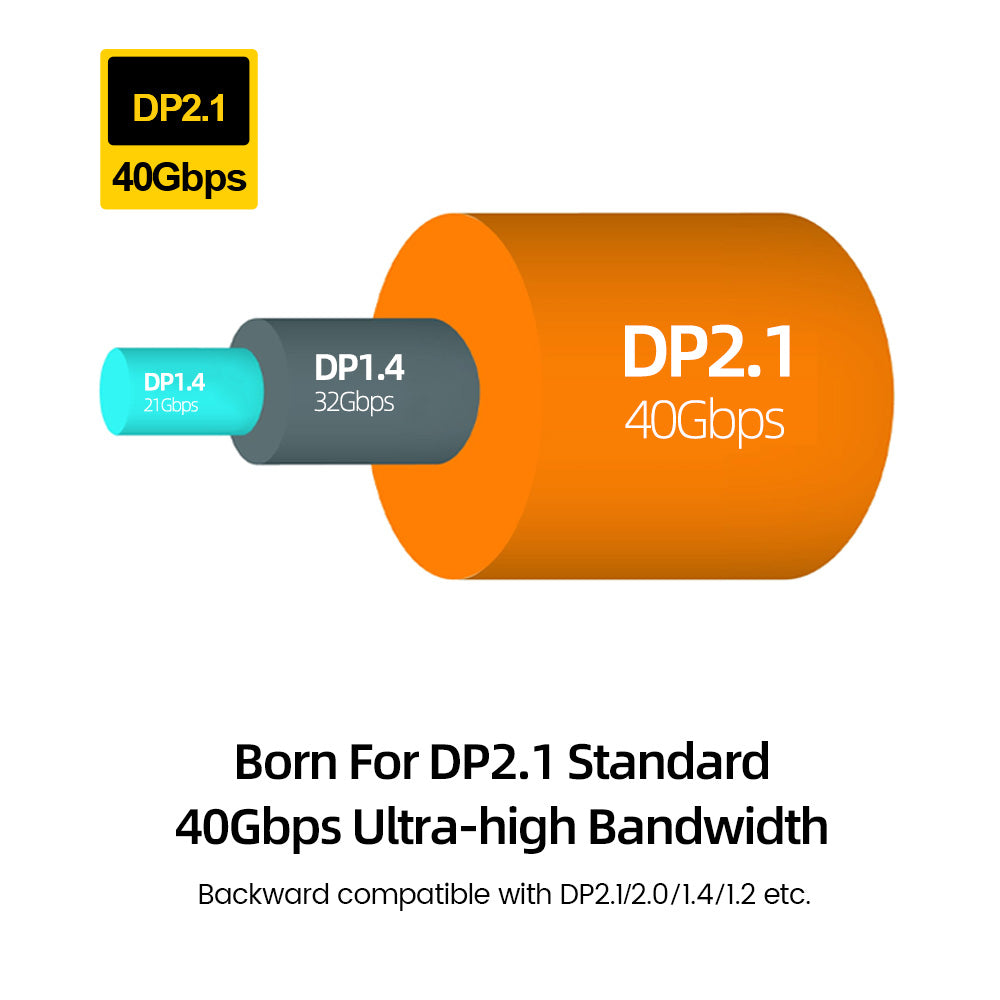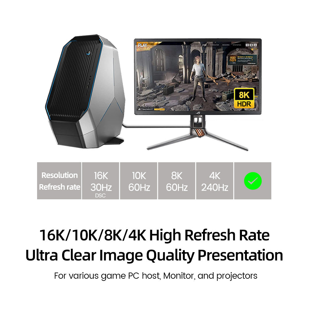 · Compliant with DisplayPort2.1 standard, support 40Gbps bandwidth and 16K@30(SDC) 10k@60 8K@60 4K@144 HDR G-SYNC FreeSYNC etc