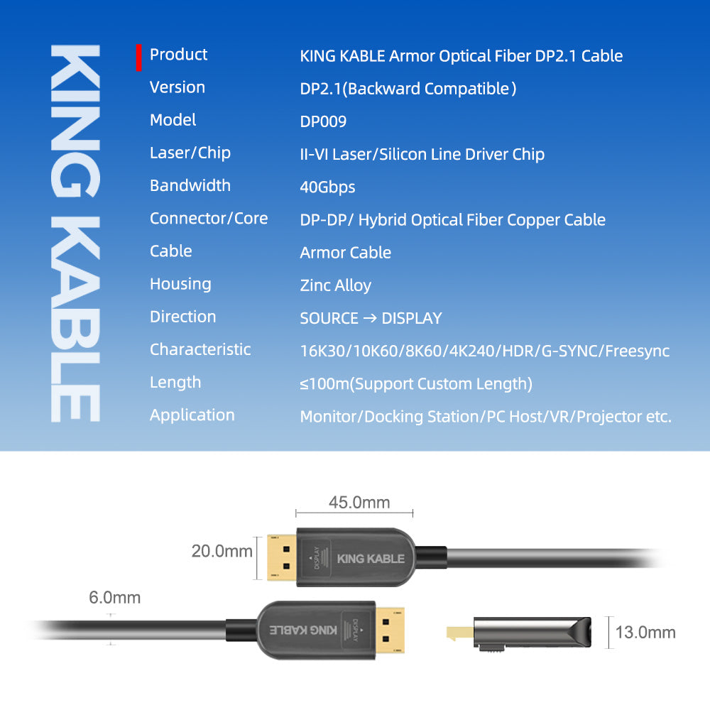 KING KABLE Armor Optical Fiber DisplayPort2.1 Cable Version DP009 Features: