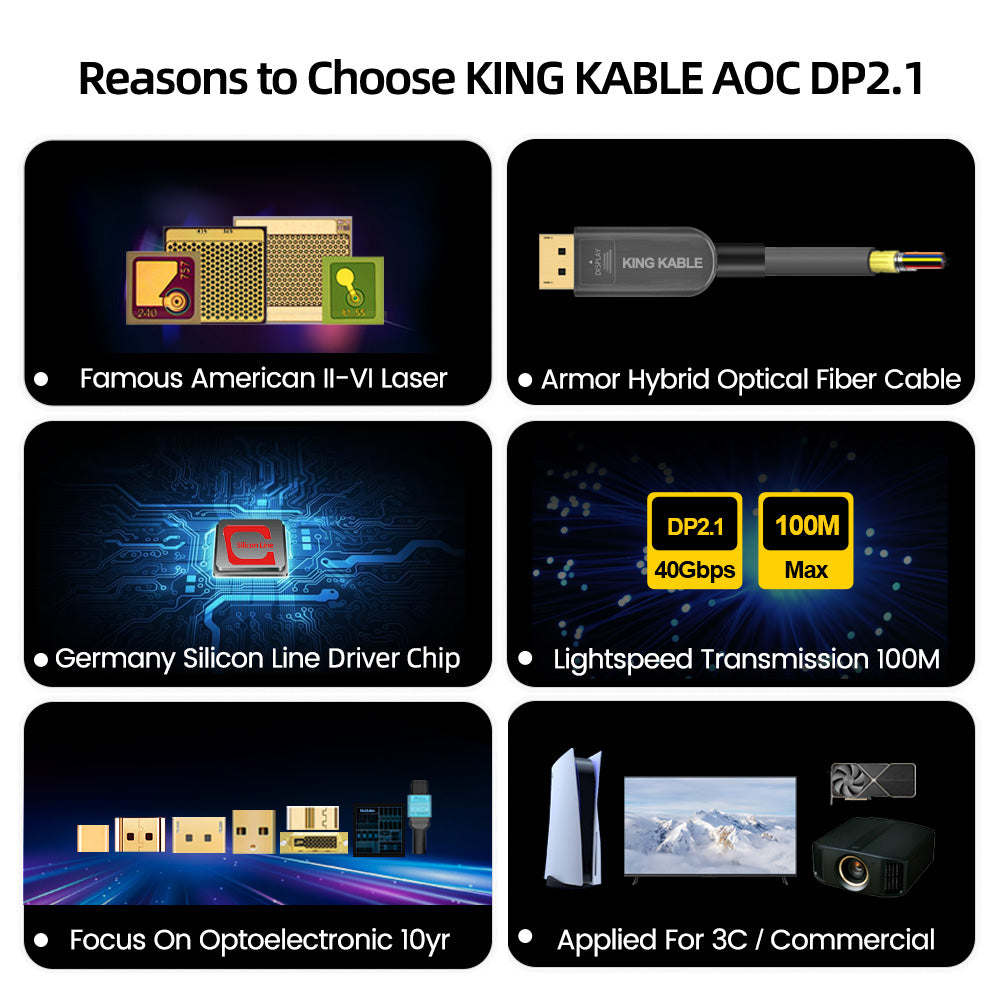 KING KABLE Armor Optical Fiber DisplayPort2.1 2.0 Cable 40Gbps 16K 10K 8K60 4K144 G-SYNC For PC Host Monitor DELL Asus SAMSUNG LG Lenovo RTX4090 3090 50M 100M DP009